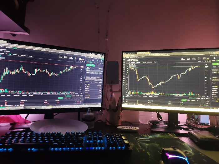 The image depicts a desk in a home office in Kfar Yona, Israel. Two computer monitors are displaying stock market charts. One monitor is on the left and one is on the right, with a keyboard and mouse in front. There is a pink fabric on the left side of the frame. There is a keyboard and mouse in the foreground. The background is a dimly lit room with pink walls. The desk is organized and clean. The monitors are displaying the charts of the day, with one showing a clear upward trend. The room is lit with a pink light coming from the walls, while a blue light is coming from the computer monitors.