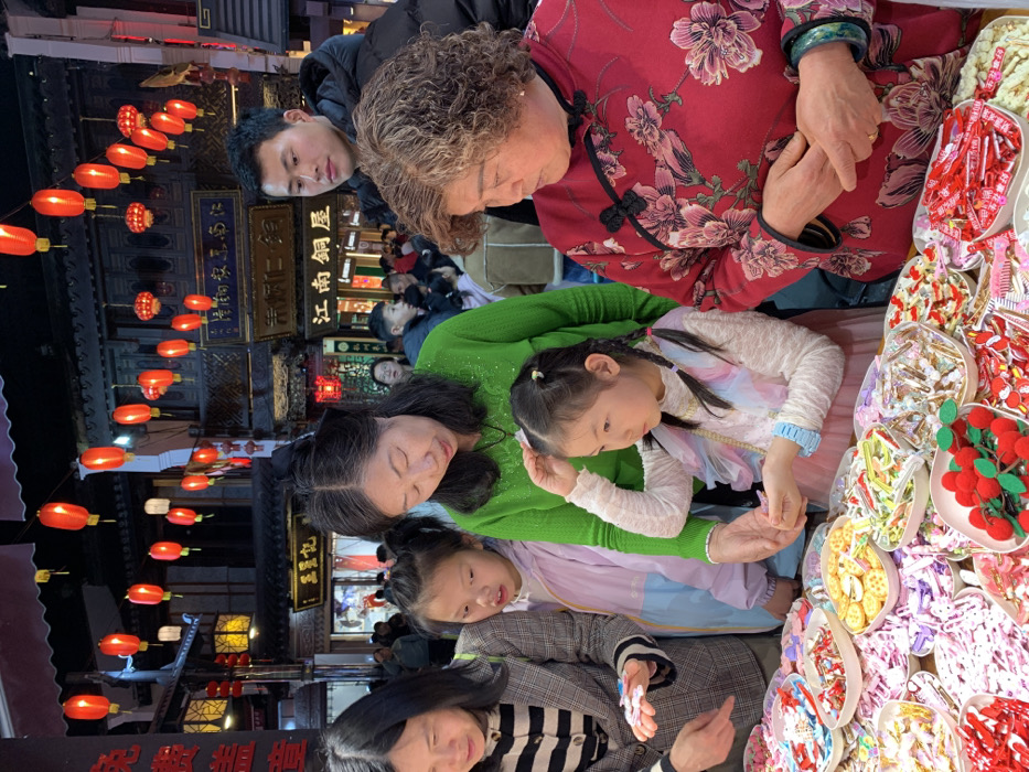The image displays a nighttime street market scene in Shangcheng District, China. In the foreground, five individuals, four females and one male, are gathered around a street stall. From left to right: A woman with dark hair, wearing a striped top and a plaid jacket, leans over the stall, holding several small, light-colored objects in her left hand and gesturing with her right. Adjacent to her, a girl with dark hair, wearing a light purple jacket, looks down at the items. Next, a woman in a bright green long-sleeved top leans forward, her left hand near the head of a younger girl. This younger girl, with dark pigtails adorned with ribbons, wears a white and multi-colored top, holding a small object in her right hand while her left hand is raised near her temple. To the right, an older woman with curly, light brown hair wears a red long-sleeved top with a floral pattern and black frog closures, and a green bracelet on her left wrist; she looks down towards the stall. In the background, a young man in a black puffer jacket stands observing the scene. The street stall occupies the lower portion of the image, displaying numerous small items, primarily hair accessories, arranged in white, heart-shaped or oval containers. These items include various colored hair clips, barrettes, and decorative bands, many individually wrapped in clear plastic. Notable items include a cluster of red, fuzzy, cherry-like objects with green stems in one bowl, and yellow circular items resembling biscuits or decorative buttons in another. The environment is illuminated by numerous red Chinese lanterns suspended overhead, with some smaller white lanterns also visible. Traditional-style buildings with dark wood exteriors and intricate carvings line the street in the background. Chinese characters are visible on signs above the shops, including "江南銅屋" (Jiangnan Copper House). The scene suggests a busy pedestrian market area with artificial lighting.