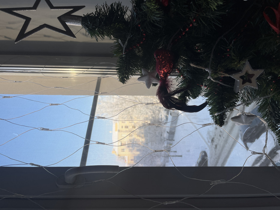 The image depicts an indoor scene looking outwards through a window onto a snow-covered urban environment in Minsk, Belarus, during daytime. In the foreground on the right, a segment of an artificial Christmas tree is visible, adorned with a silver star finial, white star ornaments (one felt, one wooden), a red glittered bird ornament with dark feathers, and red bead garlands. A net of white string Christmas lights is strung across the windowpane, partially obscuring the view. The window frame and handle are visible on the left. Outside, the ground and bare tree branches are covered in snow, indicating winter conditions. In the middle distance, a large, multi-story yellow/ochre building with numerous windows is prominent, consistent with Stalinist Empire architecture found in central Minsk, potentially near Independence Square. The sky above is clear and blue. No people are visible.