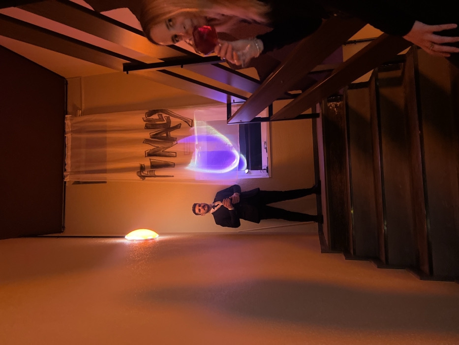 An indoor scene is depicted within a stairwell or hallway, located in Berlin, Germany. The setting is illuminated predominantly by warm, orange-toned light emanating from a semi-circular wall fixture on the left. A male individual stands at the top of a short flight of dark wooden stairs, positioned towards the center-left of the frame. He is dressed in a dark suit and dark shoes, with a mustache and beard, looking directly at the viewer. Both hands hold a small, dark, cylindrical object near his chest. Behind the male, a window is visible, covered by a sheer white curtain. A banner or fabric hanging over the window displays the word "FINALLY" in dark, stylized letters. A dynamic, abstract purple light pattern is projected onto the curtain and the adjacent wall, to the right of the window. On the right side of the image, partially obscured by a dark, angled staircase banister, a female individual with long blonde hair is present. She is holding a wine glass containing a red liquid to her mouth, looking towards the viewer. Her attire appears dark. The staircase consists of dark wooden treads and risers. The walls are a light color, reflecting the warm orange illumination, which also creates soft shadows. The ceiling is dark.