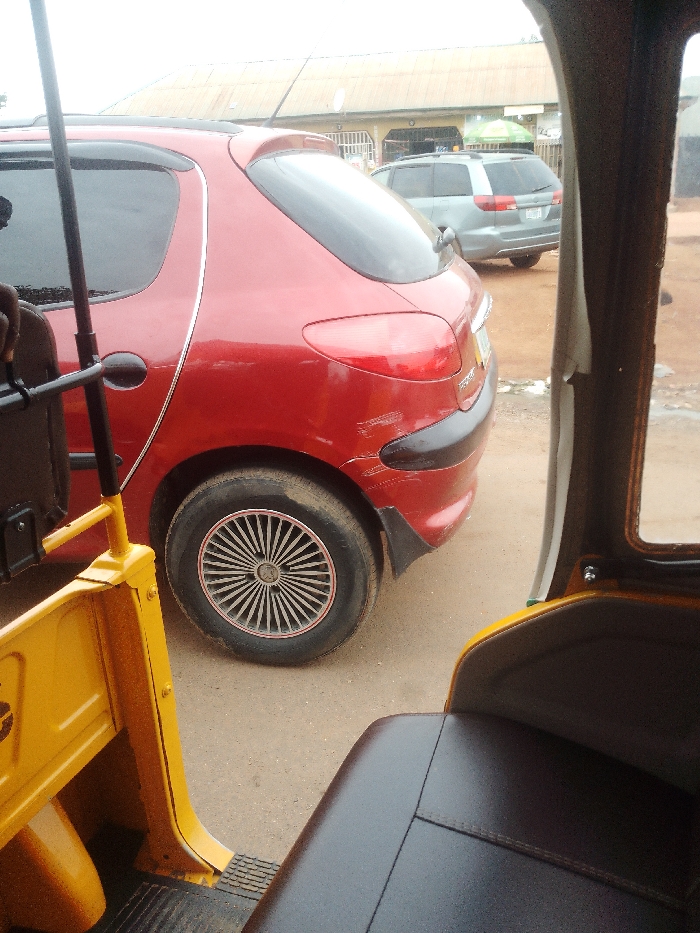 interior of a yellow auto-rickshaw. The rickshaw is parked on a street in Abuja, Nigeria, specifically at the coordinates 8.955 latitude, 7.552 longitude. The rickshaw is facing a red Peugeot 206, parked on the street. The 206 has a damaged rear bumper and a silver-colored wheel cover. The rickshaw is empty, while the car is also empty. The background shows a gray and white building with a flat roof. The sky is overcast, and there are buildings in the distance. The environment is urban, with buildings lining the street.