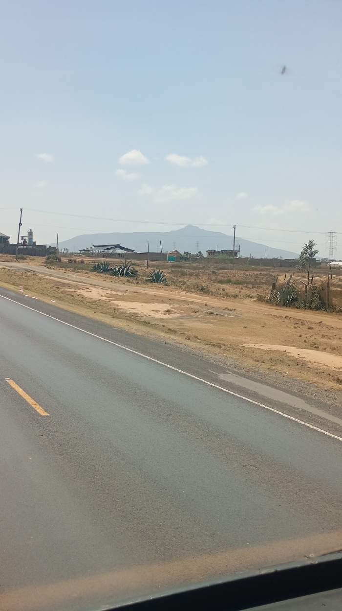 This image depicts a wide-angle view of a semi-arid landscape under a clear, light blue sky with scattered white cumulus clouds, consistent with the Hells Gate ward in Kenya. In the foreground, a dark asphalt road occupies the lower left to mid-right of the frame, showing a solid yellow line on its left edge and a broken white line further right. The very bottom of the image reveals a dark, flat surface, likely a vehicle's dashboard or window frame. The midground features a vast expanse of dry, brownish-yellow ground with patches of bare earth. Several large, spiky, succulent plants, resembling Agave, are sparsely distributed across this terrain. Towards the left, a concrete industrial structure is visible with what appears to be a silo or processing unit. Further right, a cluster of low-rise buildings with light-colored walls and dark, possibly corrugated, roofs are present, along with smaller, simpler structures, one featuring a vibrant green wall. On the far right, a wooden framework partially covered with a light-colored mesh is observed. Utility poles carrying power lines traverse the scene at various points. In the background, a large, undulating mountain range or prominent hills are silhouetted against the horizon. High-voltage power transmission towers are visible towards the right base of these distant hills. No people are visible within the frame, and no specific actions or interactions are depicted. The overall impression is an open, undeveloped to semi-developed area with elements of utility infrastructure.
