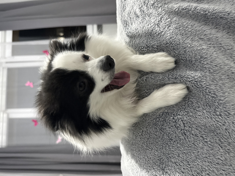 - "A small, fluffy, black and white dog is centrally positioned, resting on a grey, textured, plush surface" by FM-en3To2, licensed under CC BY 4.0