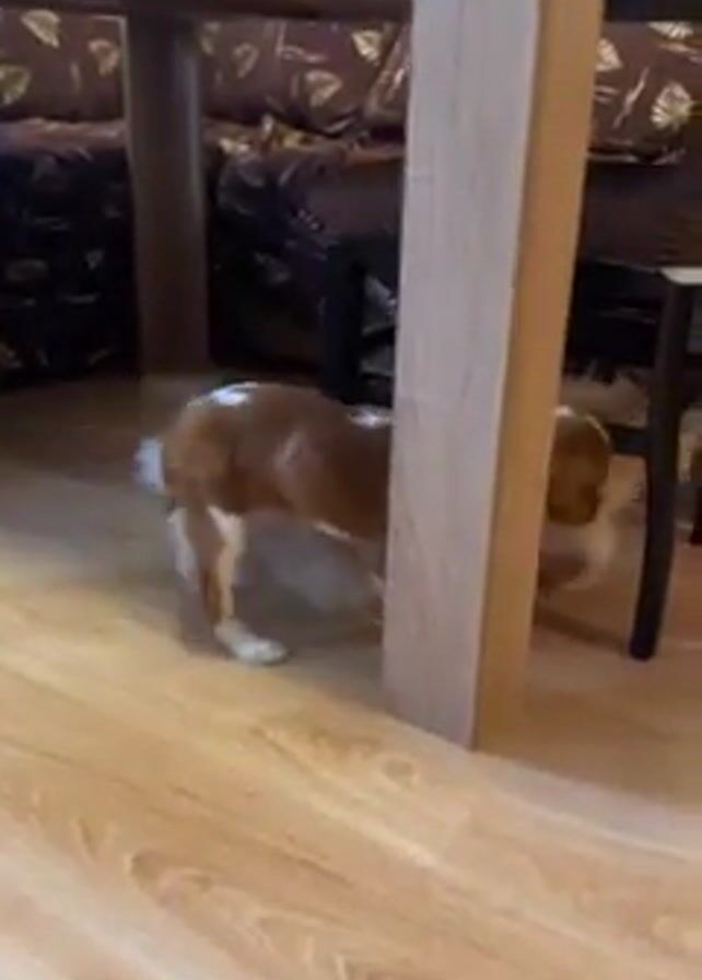 A dog chases a cat in a room. The dog is small, with brown and white fur, and a short tail that wags. The cat is fluffy, with cream-colored fur. They are playing under a wooden table with chairs, on a light brown wooden floor. In the background is a brown upholstered chair.