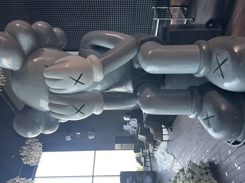 - "A large, grey KAWS "Companion" sculpture, depicting the "Seeing/Watching" pose with hands covering its eyes, stands prominently in a modern interior space identified as the Astoria Restaurant in Yerevan, Armenia" by FM-543xI3, licensed under CC BY 4.0