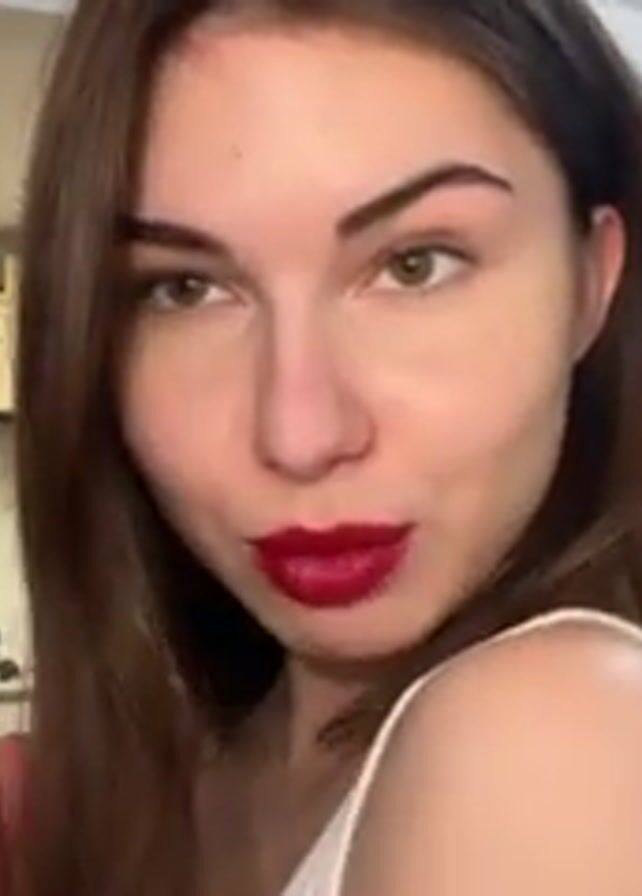 A woman with long brown hair and red lipstick is in a kitchen. She makes a surprised face, then a scrunched-up angry face, then smiles. The kitchen has light-colored cabinets, a microwave, and an abstract painting on the wall. She is wearing a white tank top.