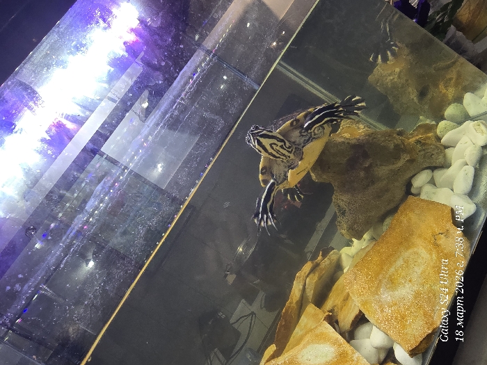The scene depicts an aquatic turtle within an illuminated aquarium, located in the city of Svishtov, Bulgaria