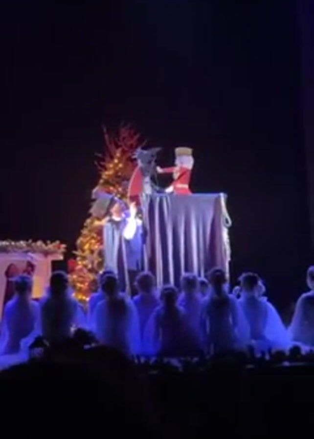 The camera looks up from the audience at a stage scene from the play "The Nutcracker