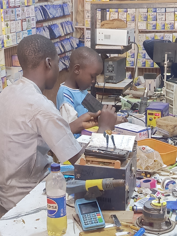 This image captures an indoor scene within an electronics repair shop in Akwanga, Nigeria