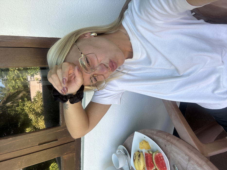 A woman with blonde hair and glasses poses, puckering her lips. She wears a white t-shirt and a black scrunchie on her wrist. A white plate of fruit sits on a round wooden table with bananas and watermelon. A white cup and saucer are beside the plate. A wooden-framed window with plants visible through the glass sits to the left of the woman. The background is white.