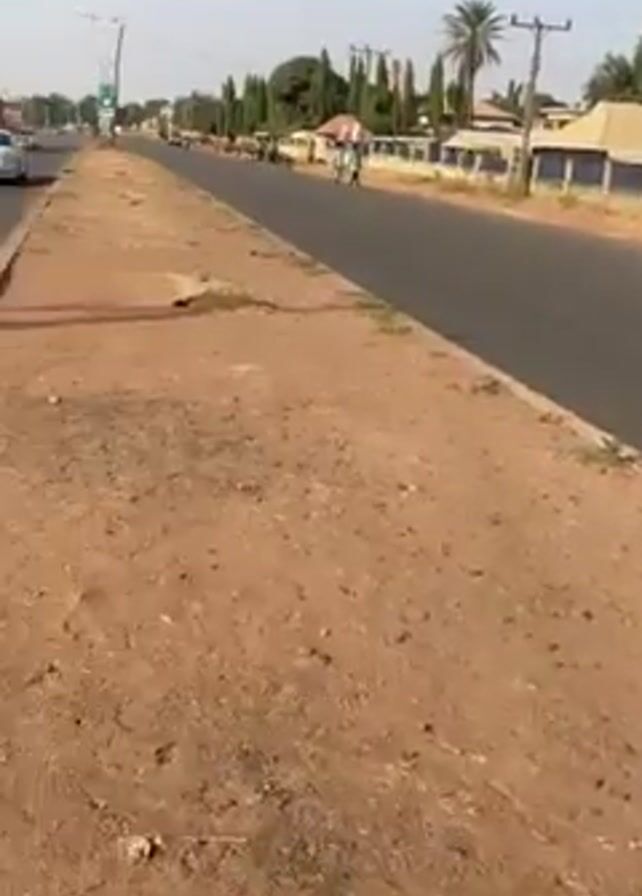 street scene, seemingly in a suburban or rural area. The road is asphalt and has some cracks. The edges of the road are dirt. Several cars and motorcycles are traveling on the road. There are trees and buildings visible in the background under a bright, sunny sky.