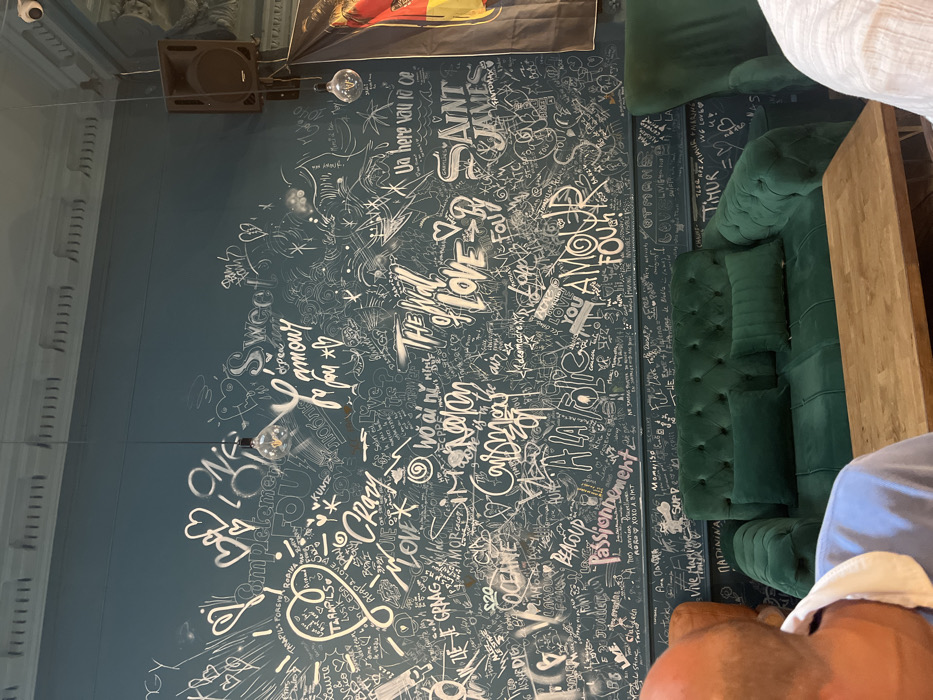 The image captures the interior of the Saint-James Pub & Grill, located at Rue du Prince Royal 54 in Ixelles (Elsene), Belgium. The scene is dominated by a dark teal-green wall extensively covered with white graffiti, featuring various handwritten names, hearts, and phrases such as "LOVE," "AMOUR FOU," "CRAZY," "The Wall of Love," and "SAINT JAMES." Two spherical, clear glass pendant light fixtures hang from the ceiling, which features classic decorative molding. A black wall-mounted speaker is positioned on the upper right side of the wall, alongside a small, black surveillance camera. Partially visible on the far right is a vertical flag or banner displaying black, red, and gold colors. Below the wall, a green velvet tufted sofa with two matching rectangular pillows is centrally placed, fronted by a rectangular light wooden table. A portion of a matching green velvet armchair is visible to the right of the sofa. In the foreground, the back of a person's head and shoulders are visible; they have a closely shaved or balding head and are wearing a light blue polo shirt with a white collar. A second person's white clothing is partially visible on the far right edge of the frame.