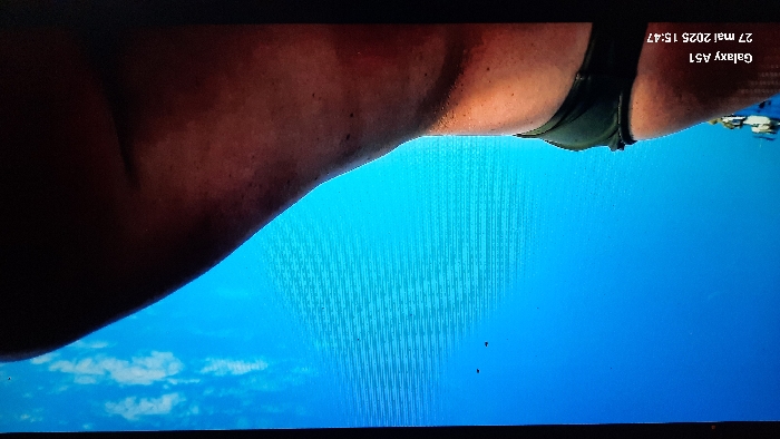 close-up of a person's body, lying on their side. The person is wearing a dark green bikini bottom. Their arm and torso are visible, and the image is taken from their waist up. Their upper body is facing the camera, while their legs are positioned facing away from the camera. The sky is visible behind them. The image has a time stamp that reads "27 mai 2025 15:47". The location is Illkirch-Graffenstaden, France, at coordinates (latitude: 48.523, longitude: 7.719). The image was likely taken on a phone, as it has the words "Galaxy A51" in the bottom left corner.