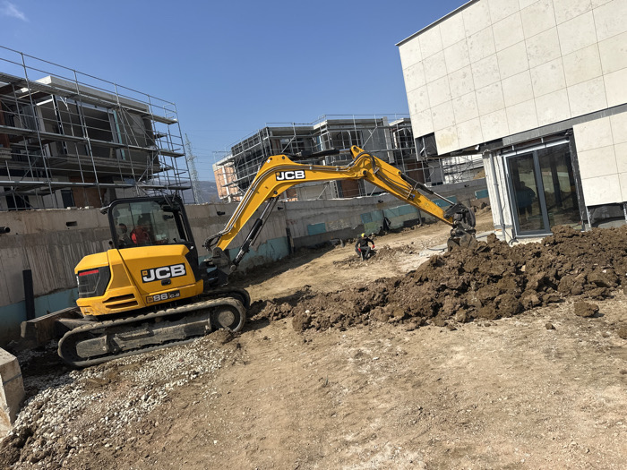 A bright yellow JCB 86C-2 compact tracked excavator is actively digging earth on a construction site located in the Manastirski Livadi - West neighborhood of Sofia, Bulgaria