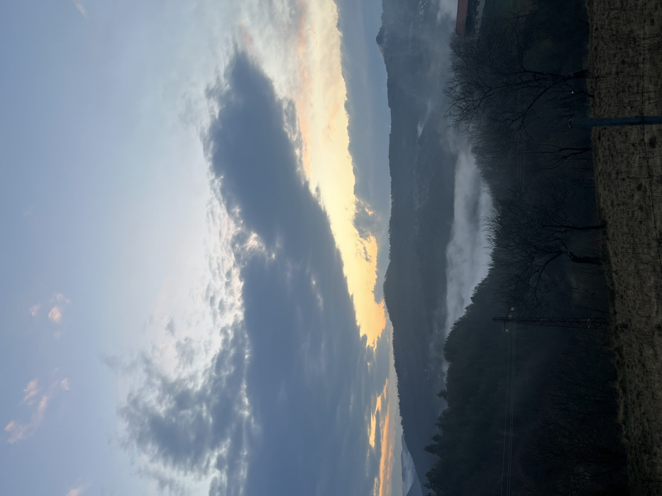 The image depicts a rural, mountainous landscape in Gradat, Bulgaria, at twilight. The sky transitions from a pale blue at the top to a band of light orange and yellow just above the distant horizon, partially obscured by an extensive formation of dark gray and lighter gray clouds that cover much of the upper and middle portions of the scene. Below the clouds, layers of dark green, forested hills and mountains recede into the distance. A significant amount of white, dense mist or fog fills the valleys between the hills, obscuring the lower elevations. In the foreground, a gentle grassy slope is visible, covered with dry, light brown vegetation. Several bare deciduous trees with dark, gnarled branches stand on this slope, devoid of leaves. To the left, a dark utility pole with at least two visible power lines extends upwards and horizontally across the mid-ground. The very bottom edge of the frame shows a wire or fence line. No individuals, overt actions, or interactions are observable. The environment is natural and rural, characterized by the mountainous terrain, mist-filled valleys, and visible infrastructure elements.