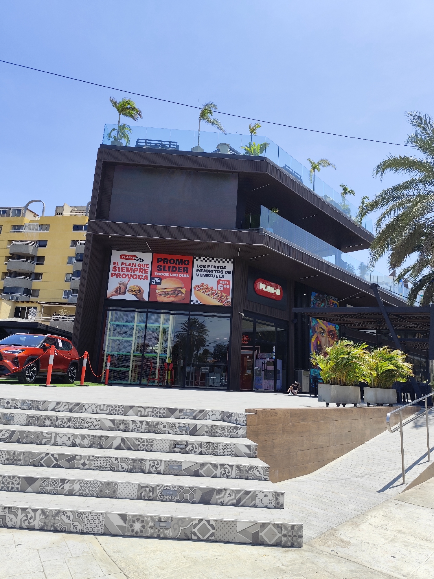 The photograph shows a Plan-B restaurant in Pampatar, Venezuela. The modern architecture of the Plan-B establishment features a multi-story building with a dark brown facade and large glass windows showcasing promotional posters for food items like sliders and Venezuelan-style hot dogs. Small palm trees are planted on the top level behind a glass railing. In front of the restaurant, there are decorative steps with gray patterned tiles leading to the entrance. A red car is parked beside the steps. A ramp with a stainless steel handrail is located next to the stairs. Tropical plants in concrete planters are placed near the entrance of the restaurant. A seated individual is seen near the restaurant's entrance. In the background is a multi-story yellow apartment building. The sky is blue and clear, indicating a sunny day.