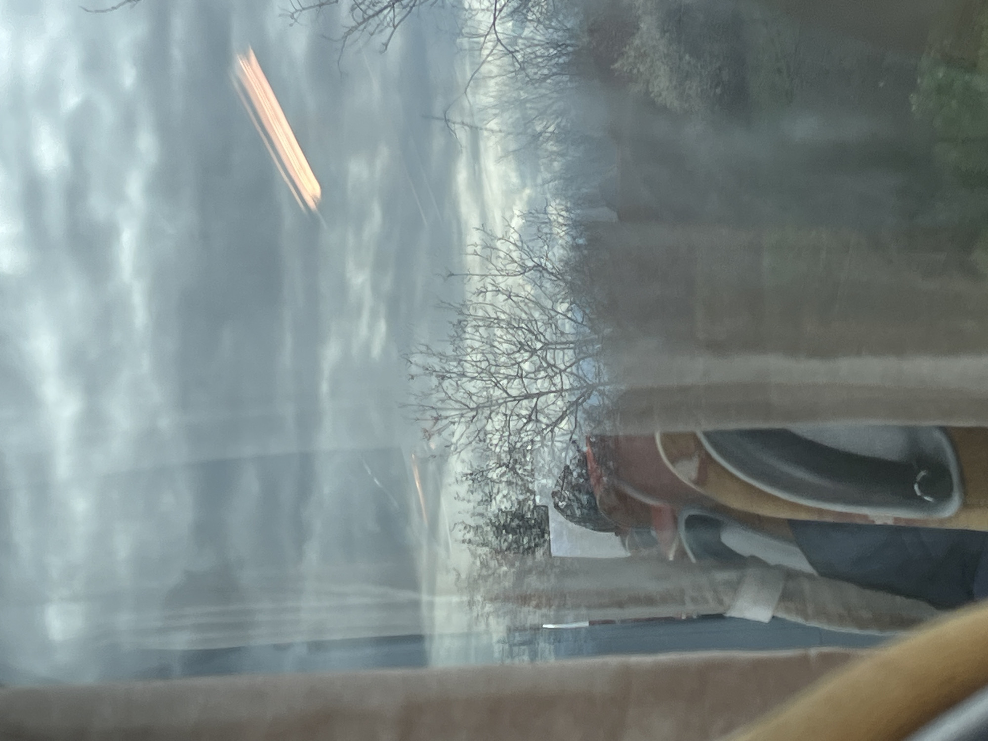 The image appears to be taken from inside a vehicle, possibly a car, looking out through the windshield. The view outside consists of a cloudy sky and bare trees, likely in winter or early spring. Reflections on the windshield obscure the details. The interior of the car is visible in the bottom of the image. There is no definitive information to confirm the location as Vinogradets, Bulgaria.