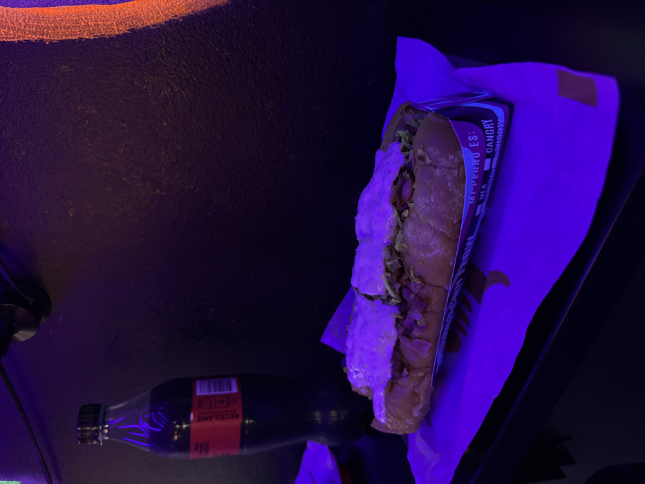 A long sandwich sits in a paper wrapper, next to a sealed bottle of Coca-Cola. The sandwich contains lettuce, meat, and mayonnaise. The wrapper is printed with text that includes "Mi Perro Es:". The coke bottle has a red label with a barcode. The overall color scheme is dark, with a purple-blue glow.