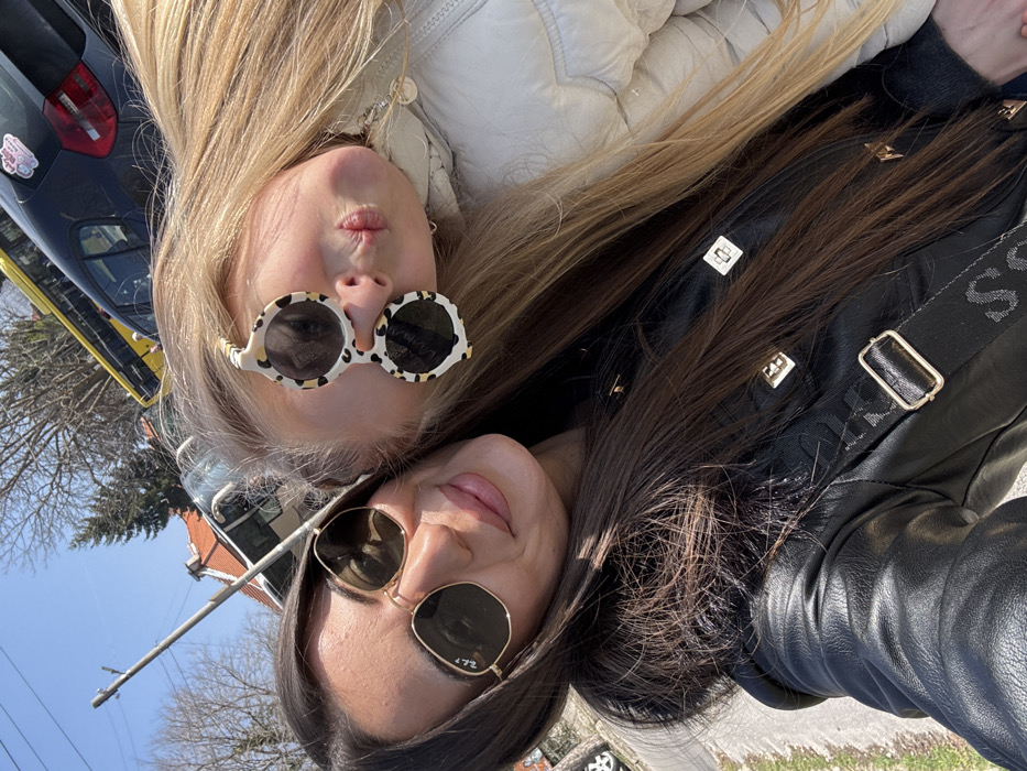 An outdoor selfie taken in Markovo, Bulgaria, depicts two individuals: an adult female and a child female