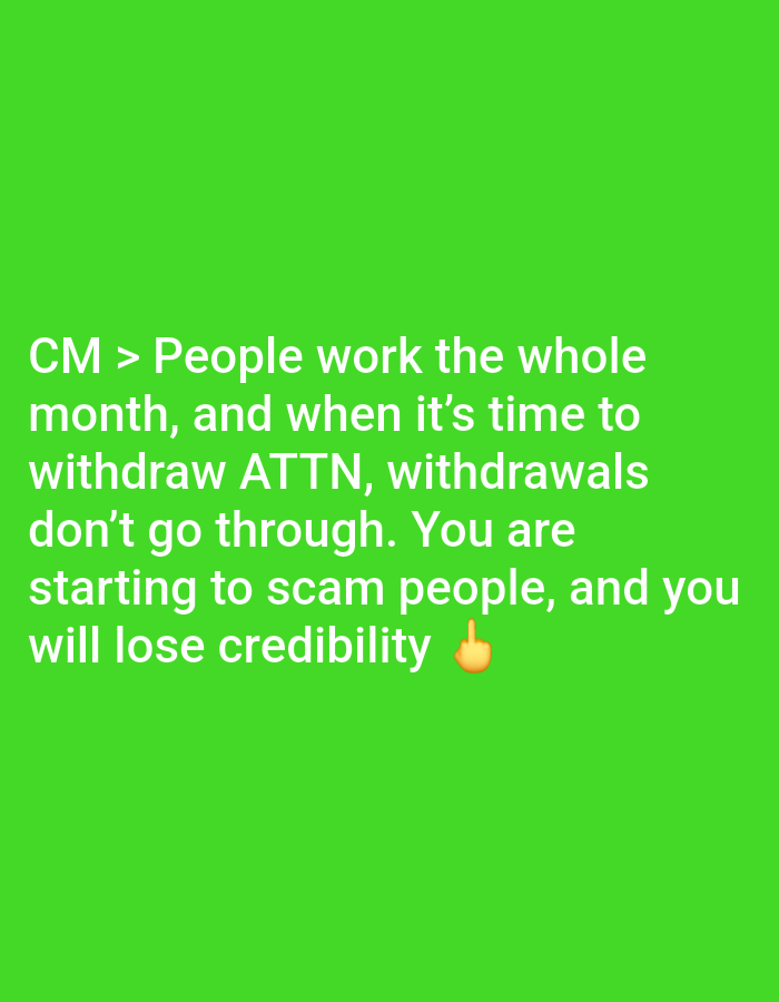 This image is a digital graphic featuring white text on a solid, vibrant green background. The text reads: "CM > People work the whole month, and when it's time to withdraw ATTN, withdrawals don't go through. You are starting to scam people, and you will lose credibility 👇". A downward-pointing finger emoji in light skin tone follows the text. The graphic does not depict any physical location, including the city of Meknes, Morocco, nor does it show any discernible people, subjects, objects, actions, interactions, or a specific environment. The entire image is comprised of text and an emoji on a plain digital background.
