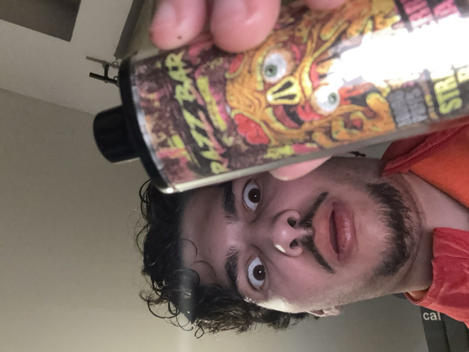 An image taken in Holtzheim, France, shows a male subject in an indoor setting. The subject, viewed from a low angle, has dark, curly hair, a prominent mustache, and a short beard. His eyes are wide open, pupils dilated, and his mouth is slightly agape. He is wearing a red and orange garment, possibly a jacket or shirt. The subject's right hand holds a cylindrical object, a "Razz Bar" branded disposable vape pen, positioned in the foreground and slightly out of focus. The vape pen features a colorful graphic depicting a grotesque, multi-eyed, yellow-skinned face with red elements. The background consists of a light-colored wall with a faint shadow line and a dark, indistinct object mounted higher on the right side.