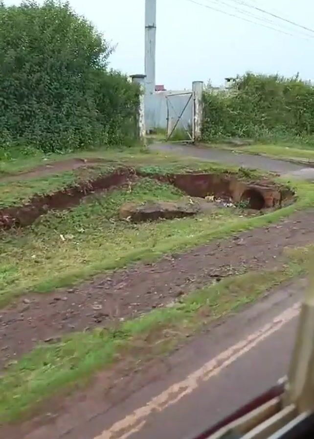 The video is shot from inside a moving vehicle, likely a bus. The view outside the window reveals a somewhat rural landscape, likely wet from recent rain. The road is paved but shows signs of wear and dirt. On the side of the road, there is a grassy area with patches of bare dirt. There are bushes and a few trees scattered around. In one shot, a small child in a light-colored jacket runs along the side of the road. Later, an adult figure is seen walking in the grass. In the background, there is a tall metal tower and a building with a gate. Power lines are visible overhead. The overall impression is a cloudy, overcast day in a developing area.