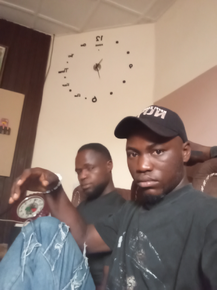 The image captures two adult males indoors within a residence located in Akwanga, Nigeria. The foreground subject, positioned to the right, is wearing a black baseball cap with white, reflective lettering, a dark short-sleeved t-shirt featuring a light graphic design, and light blue ripped jeans. He has a short beard and looks directly at the camera, indicating he is likely taking the photograph. His right arm is raised, with the hand mostly out of frame. The second subject, situated in the mid-ground to the left, is seated on a dark brown, patterned upholstered furniture item, possibly a couch. He wears a black short-sleeved t-shirt and a white beaded bracelet on his left wrist. He possesses short hair and directs his gaze slightly to his left, away from the camera. The background reveals a light-colored wall adorned with a large, minimalist wall clock displaying individual numerals and dots, with its hands indicating approximately 1:30. To the left of the second subject, a small, round analog clock or gauge with a red and green dial is visible on a surface. The room features a white paneled ceiling and dark brown wall paneling or furniture on the far left.
