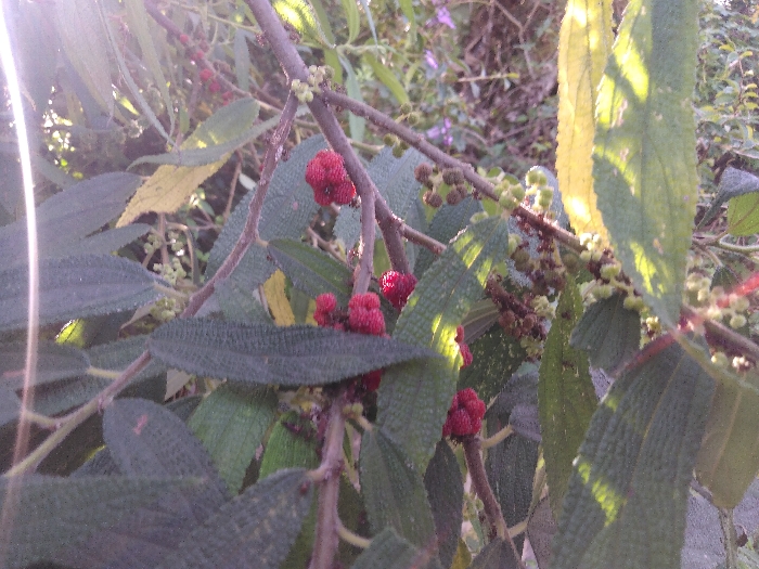 This image depicts a close-up view of a plant located in the city of Ban Naduan, Laos. The foreground and midground are filled with dense foliage consisting of dark green, textured leaves with visible venation, some exhibiting a serrated appearance. Clusters of bright reddish-pink, multi-lobed berries, approximately 0.5-1 cm in diameter, are visible attached to brown stems, primarily in the right half of the frame. Numerous smaller, light green, spherical buds or unripe fruits are also present in clusters throughout the branches. Sunlight enters from the upper left, creating bright yellow-green highlights on some leaves and a lens flare. The background is blurred, showing additional green and yellowish foliage, consistent with an outdoor, natural environment. No individuals or man-made objects are discernible.
