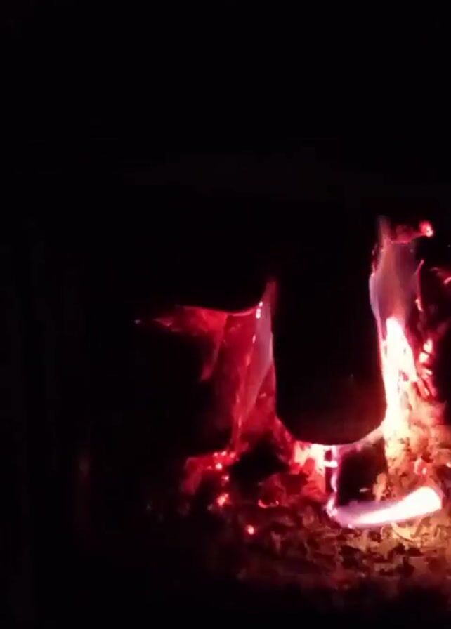 dark room with a fire burning inside a hearth. The fire is mostly red and orange, with some white flames in the center. There are chunks of wood burning in the fire. The overall scene is dark and warm, with the fire providing the only light source.