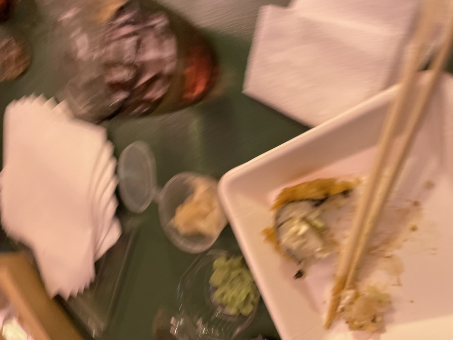 A blurred overhead shot captures a nearly finished sushi meal. A white container holds remnants of fried sushi alongside chopsticks. Condiments, possibly wasabi and ginger, sit in small containers. A stack of napkins and a foil-wrapped object are also visible on the green surface. The scene suggests a casual dining setting.