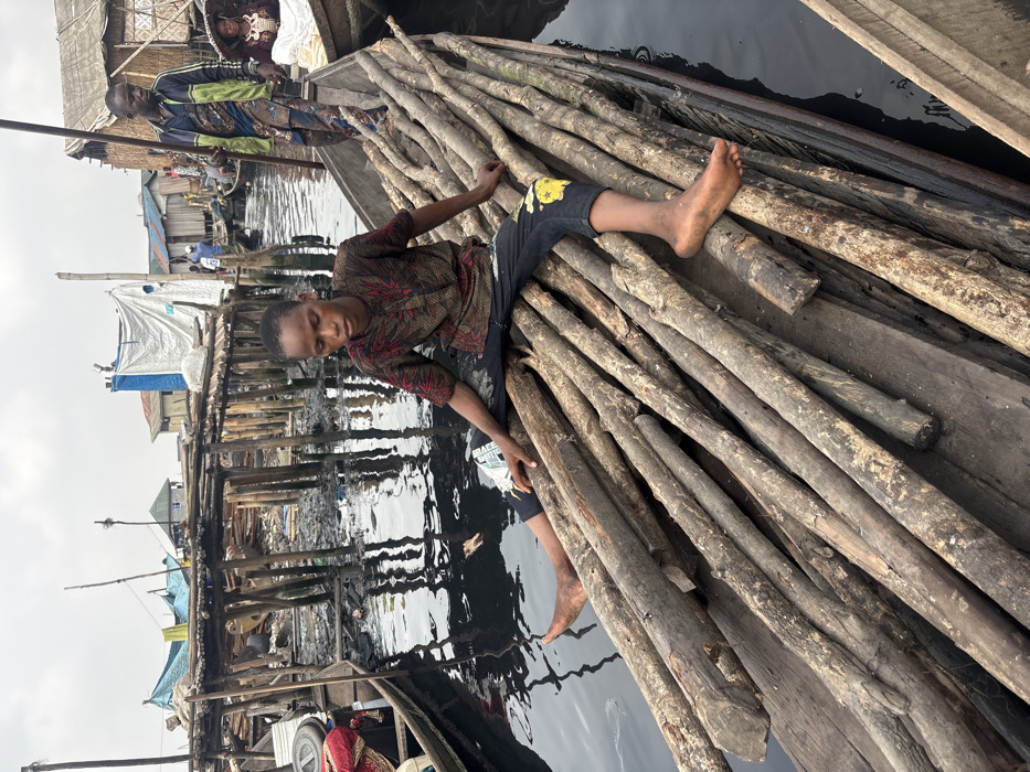 The scene depicts a waterborne settlement in Iwaya, Nigeria, characterized by stilt structures over dark, reflective water containing visible debris. In the foreground, a young male, likely a child or adolescent, with dark skin and short dark hair, sits barefoot on a pile of roughly cut wooden logs within a narrow, wooden canoe. He wears a short-sleeved collared shirt with a red, black, and tan patterned design, and dark trousers or jeans with light-colored patterns on the lower legs. His gaze is directed downwards and slightly to the left. The canoe, filled with approximately two dozen logs, occupies the center and right side of the frame. In the mid-ground, behind and to the right of the sitting boy, an adult male stands upright in another wooden canoe. He wears a blue and green patterned jacket over a patterned shirt and patterned trousers, holding a long wooden pole, suggesting he is navigating or preparing to navigate the boat. Further back and to his right, a woman with a wide-brimmed hat is partially visible in a third canoe. The background features numerous wooden stilt structures supporting dwellings and walkways over the water, characteristic of a slum or informal settlement. These structures are constructed from various materials including wood, corrugated metal, and tarpaulins. The sky is overcast. The water surface shows ripples and reflections, and appears polluted with scattered refuse.