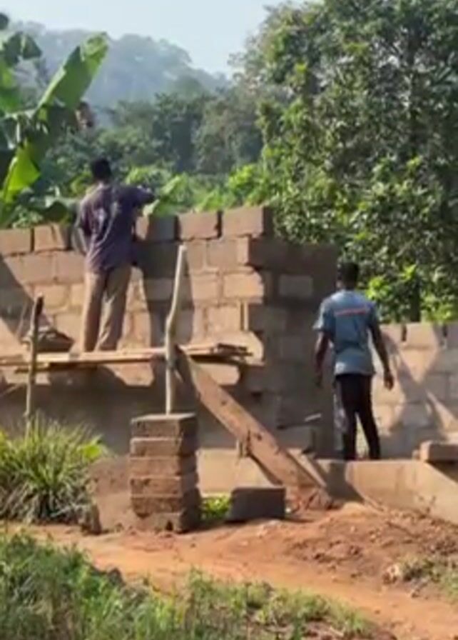 Two men are building a wall made of cinder blocks. The man on the left is standing on a makeshift platform of planks propped up on blocks, laying cinder blocks on top of the existing wall. He is wearing a dark t-shirt and light brown pants. The man on the right is standing on the ground next to a section of the wall that is already complete. He is wearing a blue t-shirt and dark pants. There is a stack of cinder blocks next to the platform. The wall is being built in a lush, green environment with trees and vegetation in the background. The sky is clear and sunny.