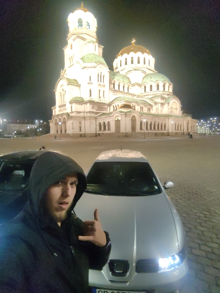 The image captures a nighttime scene in Sofia, Bulgaria, featuring the illuminated St. Alexander Nevsky Cathedral in the background. A male individual with fair skin, a short beard, and a mustache occupies the immediate foreground on the left. He is wearing a dark, hooded jacket with the hood pulled over his head, looking directly towards the camera. His right hand is raised, performing a "shaka" hand gesture (thumb and pinky extended, middle fingers curled). To the right of the individual, a silver Seat Leon (first generation) passenger car is parked, facing the camera. Its headlights are illuminated, emitting a bright white light. A partial view of a dark-colored vehicle is visible behind the individual on the far left. The license plate of the silver car, partially obscured, begins with "CB." The St. Alexander Nevsky Cathedral, a large, ornate Orthodox church, dominates the background. It features multiple domes, some green and some golden, and a prominent bell tower, all brightly illuminated. The ground in the foreground is paved with cobblestones. In the distant right background, two indistinct figures are visible walking across the square. The sky is dark, indicating night.