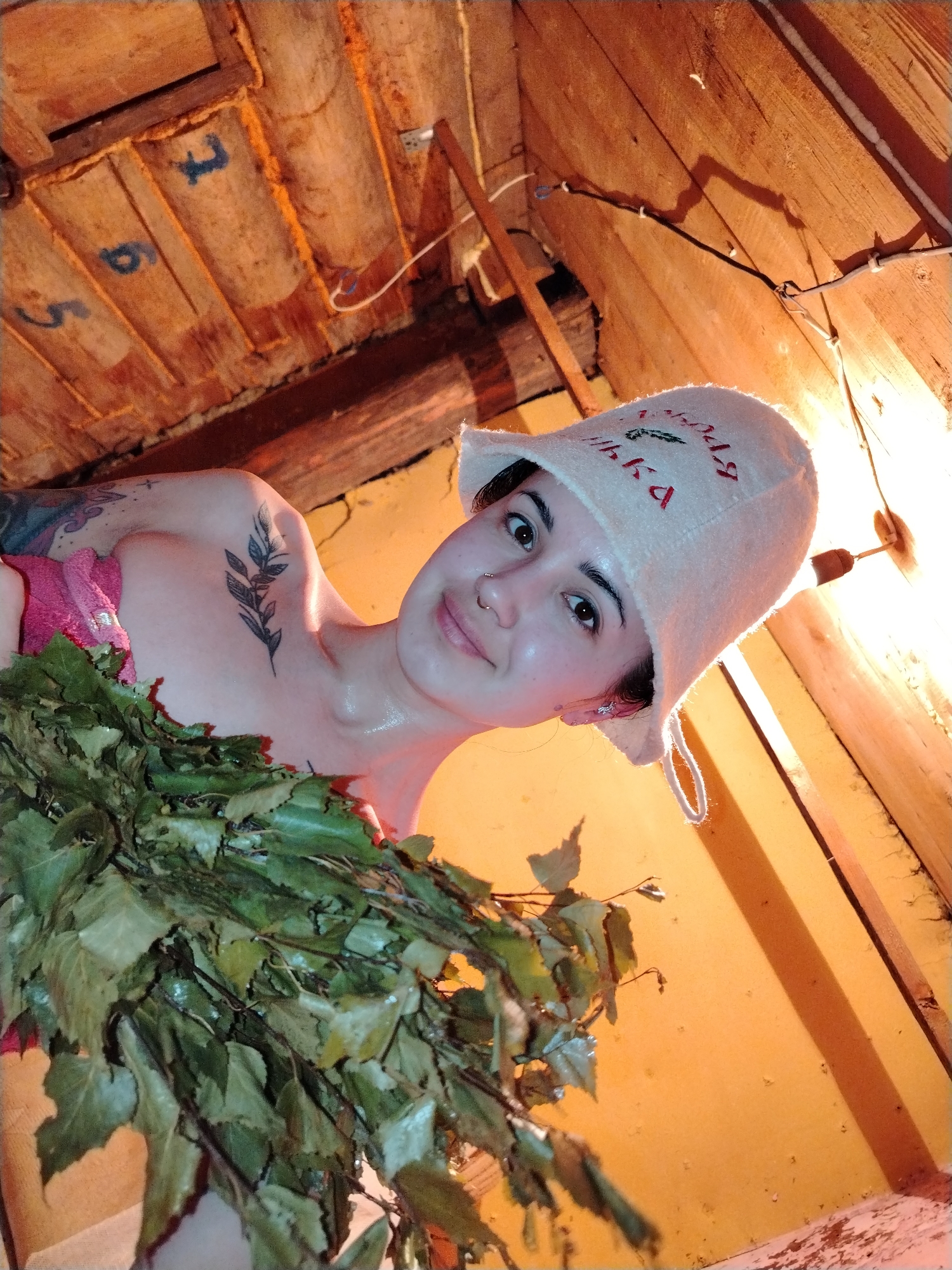- "A low-angle photograph captures a female individual in a banya setting in Гожан, Russia" by FM-J8Ma03, licensed under CC BY 4.0