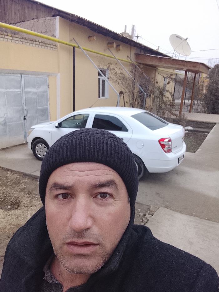 An outdoor scene in Yangiaryk, Uzbekistan, depicts a male subject in the foreground captured in a selfie perspective, with a residential building and a parked vehicle in the background