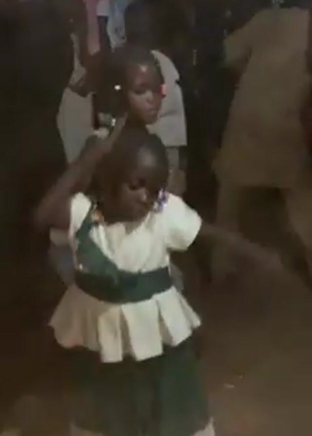 two young girls dancing in a crowd of people. The lighting is poor, and the colors are slightly desaturated. One girl wears a white and green dress and is actively performing dance moves, while the other, in a plaid dress, appears more observant. The surroundings suggest an outdoor event, possibly a celebration, with people moving around in the background.
