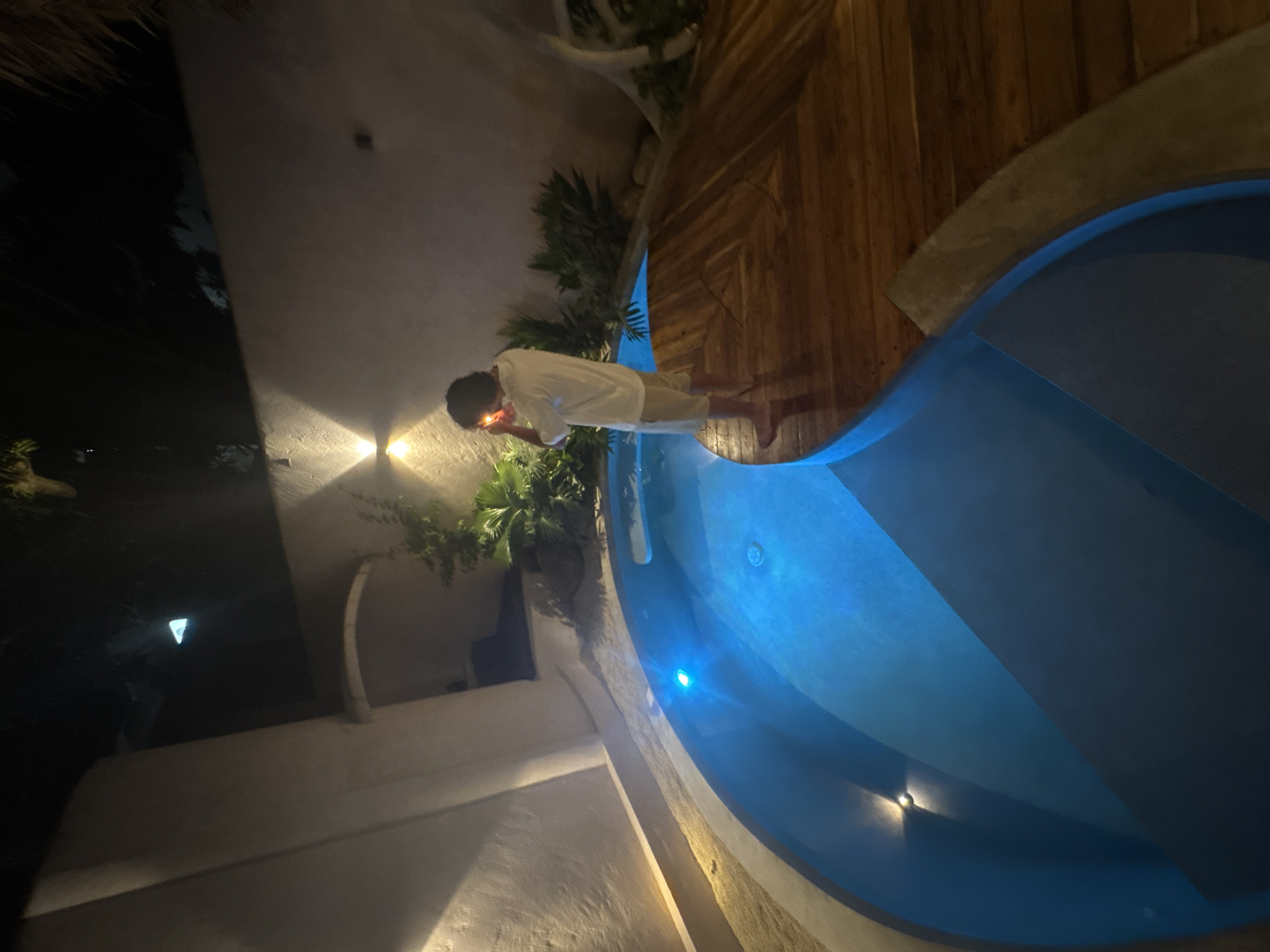 This nighttime image depicts an outdoor private pool area in El Nido, Philippines. A single individual, an adult male with dark hair, stands barefoot on a circular wooden deck at the pool's edge. He wears a white short-sleeved shirt and light-colored shorts. The male is positioned with his back mostly to the camera, his head slightly turned to the left, and is actively lighting an unseen object held between both hands near his face, indicated by a bright orange flame. The irregularly shaped pool contains blue-lit water, with at least one visible underwater light source on the left side. Light-colored coping borders the pool, and steps are visible descending into the water on the left. Surrounding the pool are white, textured stucco walls, illuminated by warm-toned, upward and downward-facing wall lights, particularly prominent on the left. Tropical vegetation, including palms and various leafy plants, is strategically placed around the pool area and against the walls. In the upper left background, an arched alcove is visible within the wall structure. The wooden deck features planks arranged in a distinct pattern, curving with the pool's edge. The sky above is dark and indistinct.