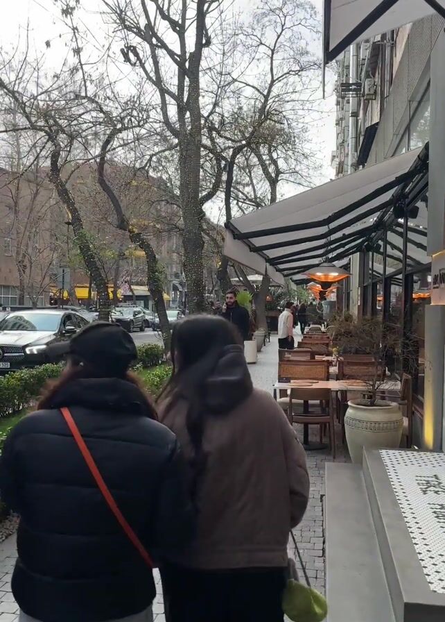 Two women walk along a sidewalk on a cloudy day. One woman wears a black jacket with an orange strap and the other wears a brown jacket. They are walking away from the camera. To their right is an outdoor dining area with tables and chairs under a striped awning. Trees line the street, some adorned with lights. Other pedestrians can be seen further down the sidewalk. Cars are parked along the street on the left side of the frame.