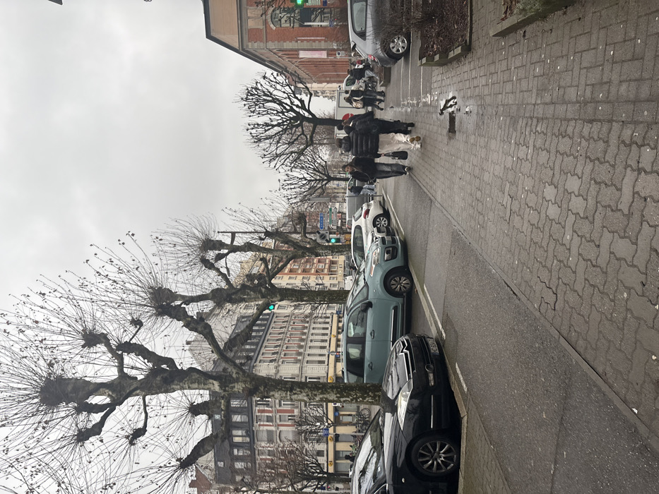 The image depicts an urban street scene on an overcast day in Strasbourg, France, specifically on **Avenue de la Forêt-Noire**, looking generally southwest. The environment is characterized by a wide asphalt road with designated parallel parking spaces along both sides. A paved sidewalk of interlocking gray pavers lines the right side of the road, showing wet patches and reflections from recent precipitation. Numerous heavily pollarded deciduous trees, bare of leaves, line both sides of the street, with their gnarled branches forming intricate patterns against the uniformly gray, overcast sky. On the left side of the street, several multi-story buildings with traditional French architecture are visible. These buildings feature light-colored facades (beige, white, and a muted pinkish hue), multiple windows, and dark sloped or mansard roofs. A green traffic light is visible against these buildings. Near the foreground on the left, a building with a blue sign (partially obscured) has several bicycles parked in front of it. On the right side of the street, a large, multi-story building constructed of reddish-brown brick with stone accents around its arched windows dominates the mid-ground. A light-colored banner with pink or red elements hangs from its facade. This building is identifiable as the former École Nationale d'Administration (ENA) at 19 Avenue de la Forêt-Noire. Another green traffic light is visible further down the street on this side. Multiple vehicles are parked. In the foreground on the left, a dark-colored (likely black or dark blue) sedan, possibly a Citroën C6, is partially visible. Behind it, a light blue/turquoise Citroën C3 Picasso is parked. Further back, a white compact hatchback is visible. On the right side, a gray compact car is parked. A white van is visible further down the street on the right. Approximately 8-10 pedestrians are observed on the right-hand sidewalk, primarily walking away from the camera in a general southwest direction. A group of 4-5 individuals is in the mid-ground, mostly in casual winter attire including dark jackets and long pants. One person in this group wears a dark puffer jacket, light-colored pants, and light shoes. Other pedestrians are visible further in the background near the white van. No specific interactions between individuals are discernible; all appear to be walking. A blue road sign, providing directional information, is partially visible in the mid-ground on the left side of the road.