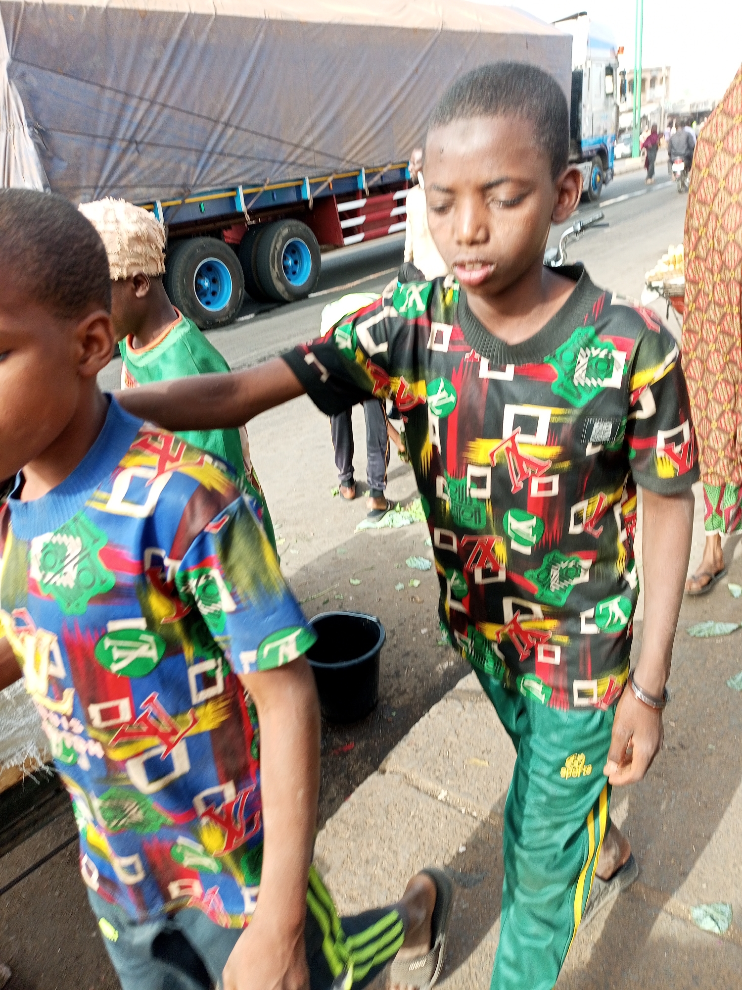 The image depicts a daytime street scene in the city of Gombe, Nigeria. In the foreground, two young males are partially visible. On the left, a boy wears a blue short-sleeved shirt with a multi-colored geometric and "LV" style pattern. His head is largely out of frame, showing the side of his face and ear. To his right, a second boy, facing forward and looking downwards, wears a dark-colored short-sleeved shirt with a similar multi-colored geometric and "LV" style pattern. He wears green track pants with yellow side stripes and "op sports" branding, and dark slide sandals. His right arm is extended, resting on the first boy's back or shoulder area. A person in a light green shirt and a light-colored, textured cap is partially visible behind the first boy. The ground is paved and littered with green leaf-like debris. A black bucket rests on the ground near the center-left. In the mid-ground, a large truck with a grey tarp-covered cargo bed and blue wheels is prominent. Further in the background, a street is visible with additional people, including one riding a motorcycle, and another truck. On the far right, a person in a patterned red, orange, and brown garment is partially visible, alongside what appears to be a vendor's display with light-colored goods.
