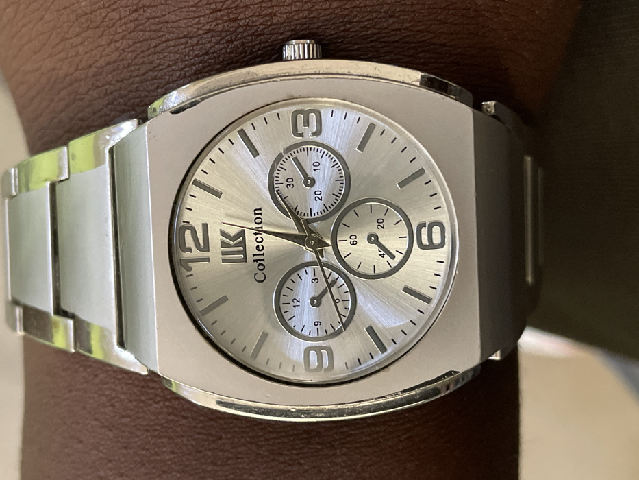 The image presents a close-up, top-down view of a silver-colored metallic wristwatch secured on a human wrist. The visible skin is dark brown. The watch features a square-shaped case with rounded edges and a multi-link metal band. Its circular dial is a light silver-grey with a radial brushed or sunburst finish. Hour markers consist of applied silver-colored rectangular indices and black Arabic numerals at the 12, 3, 6, and 9 o'clock positions. Three sub-dials are present: one at 9 o'clock marked 3, 6, 9, 12; one at 3 o'clock marked 10, 20, 30; and one at 6 o'clock marked 20, 40, 60. The brand "IK Collection" is inscribed below the 12 o'clock position. The main hour, minute, and second hands, as well as the sub-dial hands, are dark metallic. A grooved crown is visible on the right side of the watch case. The immediate background is the dark brown skin of the wearer's arm, with a blurred, lighter-toned, indistinct area visible in the lower left portion of the frame. The image provides no discernible visual information to corroborate the requested location of Jos, Nigeria.