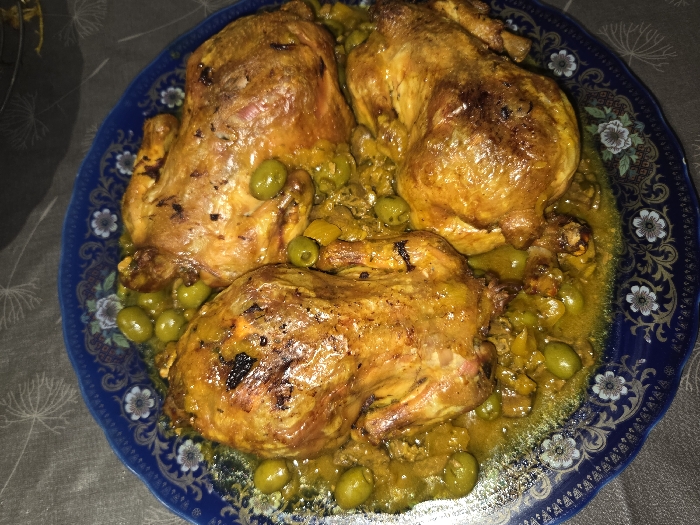 The image displays a large, round, dark blue serving platter containing three whole, golden-brown roasted or braised chickens. The chickens are nestled in a thick, yellowish-green sauce abundant with whole green olives. The blue platter is edged with intricate gold and white floral and foliate patterns. This culinary arrangement rests on a dark grey surface, identified as a tablecloth, which features a faint, lighter-colored botanical pattern. The scene is situated in Hérouville-Saint-Clair, France.