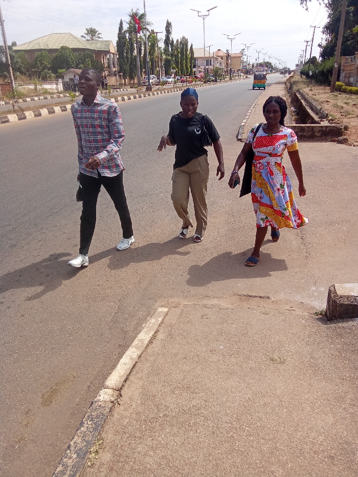 The image depicts a daytime street scene in Bar Jirgi Summa, Nigeria. Three individuals are walking from left to right across an unpaved dirt surface, adjacent to a paved asphalt roadway. The leftmost subject, a male, wears a red, blue, and white plaid long-sleeved shirt, black trousers, and white athletic shoes, holding a dark object in his left hand. The central subject, a female, wears a black short-sleeved t-shirt, light brown trousers, white open-toed sandals, and a dark head covering, with a black shoulder bag on her left shoulder. The rightmost subject, a female, wears a multi-colored patterned short-sleeved dress and blue open-toed sandals, carrying a dark shoulder bag on her left and a dark smartphone in her right hand. Their shadows are cast to their right, indicating bright sunlight. The background features a wide asphalt road, divided by a concrete median containing solar-powered streetlights and tall, slender trees. Various multi-story buildings are visible along the roadside, including one with a green-tiled roof on the left. A red and white flag is flying from a pole in the distant left. A light green three-wheeled auto-rickshaw is visible on the road in the mid-ground. A concrete curb separates the unpaved foreground from the main road surface.