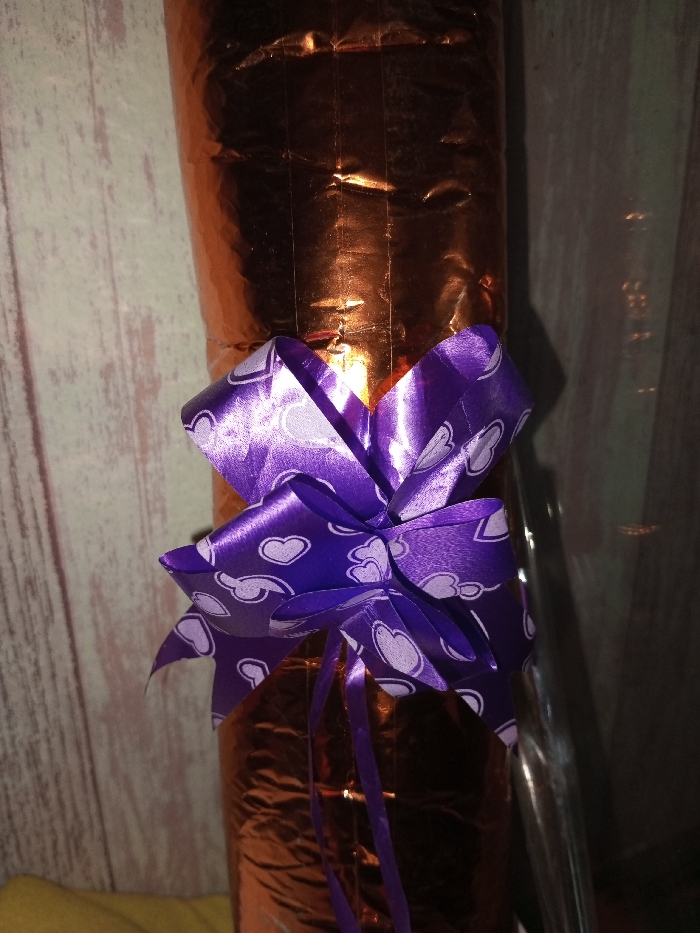A gift, wrapped in orange metallic paper with visible creases and lines, is adorned with a bright purple satin ribbon. The ribbon is patterned with white hearts. The gift stands tall, with a light-colored wooden wall in the background. A hint of yellow fabric is visible at the bottom left. A shiny, clear material is on the right.