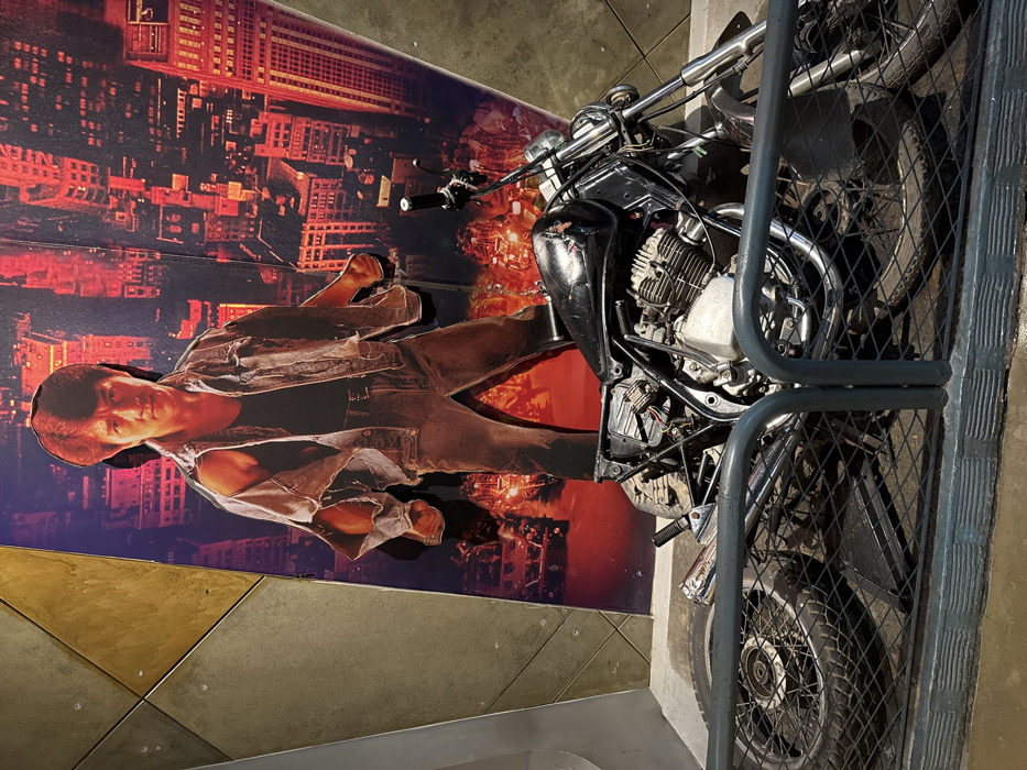 The image displays an indoor exhibition featuring a life-sized cutout of actor Jackie Chan, positioned centrally in a dynamic stance. Chan is depicted wearing a distressed light denim jacket over a black tank top, dark pants, and has both fists clenched. This cutout stands before a large backdrop illustrating a stylized urban night skyline, predominantly illuminated in red and orange hues. In the foreground, a black motorcycle lies horizontally on its left side, revealing an exposed engine, visible wiring, a silver exhaust pipe, and a scuffed black fuel tank. A dark grey metal barrier, resembling a decorative railing, spans the lower portion of the frame, separating the motorcycle from the viewer. To the left, a wall constructed from large, angular, brownish-gold textured panels is visible. The floor is a smooth, light brown surface. This scene is located within an entertainment or exhibition venue in Chaoyang District, China.