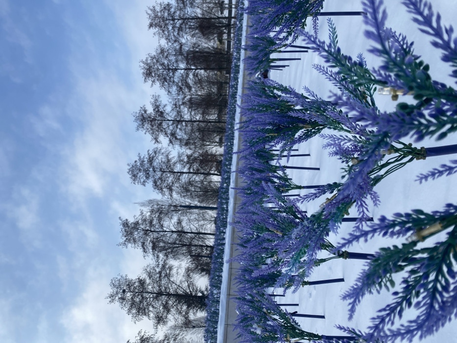 The image depicts a static winter scene in Krasnodar, Russia. The foreground features a dense arrangement of numerous artificial lavender-like plants, colored purple and green, protruding from a uniform layer of white snow. Small light-emitting diodes are intermittently visible within these artificial plant structures. A low, light-toned horizontal retaining wall or planter box spans the midground. Behind this wall, another section of similar artificial lavender plants is partially visible, also embedded in snow. The background is dominated by a dense line of bare deciduous trees with dark trunks and branches, silhouetted against a pale blue sky with scattered white clouds. No individuals are present in the scene, and no overt actions or interactions are depicted.