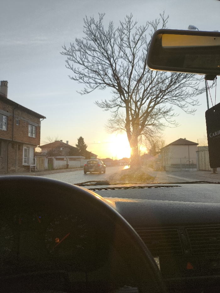 - "The image depicts a street scene in Войводино, Bulgaria, observed from the interior of a vehicle during either sunrise or sunset" by FM-tZadP2, licensed under CC BY 4.0