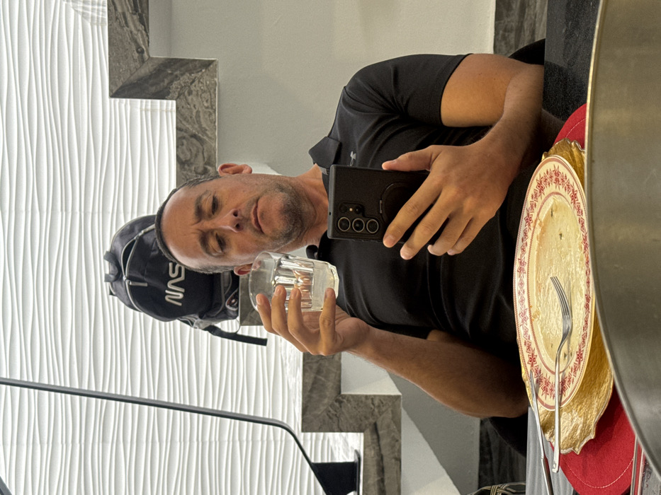 A man in a black shirt holds a glass in his left hand and a cell phone in his right. A backpack with "NASA" printed on it hangs in the background. A plate with food residue and a fork sits on a golden placemat with a red napkin. The man appears to be taking a selfie in front of a textured white wall with gray marble accents. The scene seems to be indoors, possibly in a dining area.