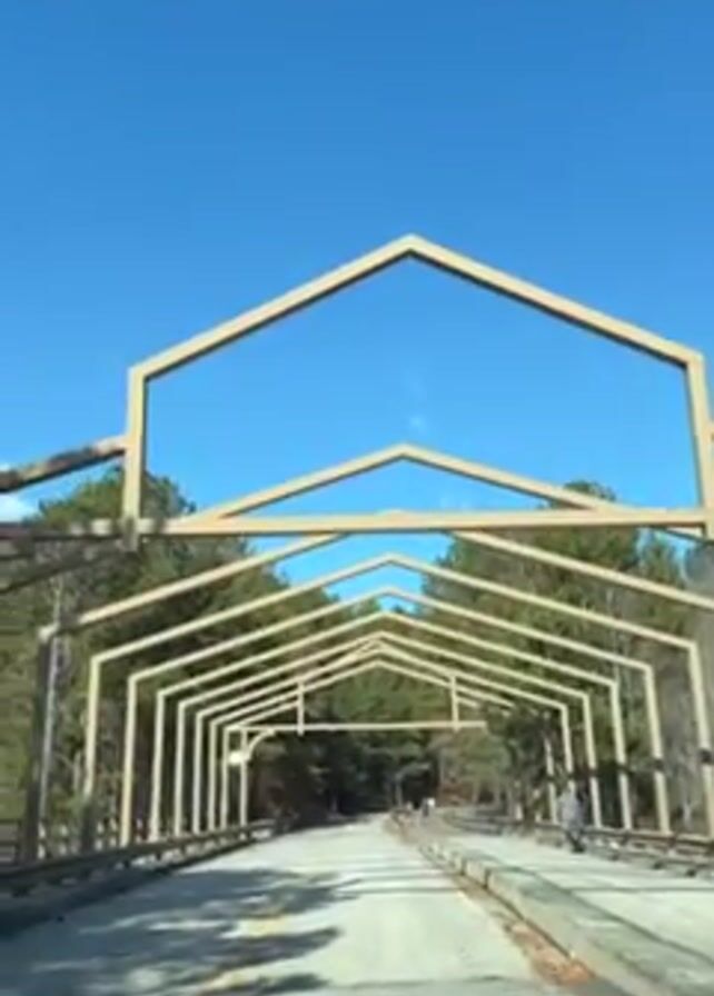 A driver in a red vehicle passes through a series of geometric frames on a bridge. The frames create an open tunnel-like structure overhead, with each frame resembling the outline of a simple house. The road surface is gray concrete with dark streaks, likely from tire marks. On the bridge's pedestrian walkways, there are a few people walking. The environment consists of a clear blue sky and pine trees lining the sides of the bridge. The scene is well-lit, suggesting a sunny day.