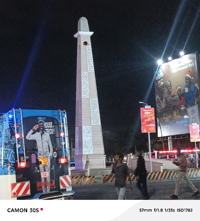 - "At night, a column-like structure with geometric patterns stands tall next to a truck branded "HOUSE OF TRICKY," featuring a man in a light-colored outfit" by FM-5CM7k1, licensed under CC BY 4.0
